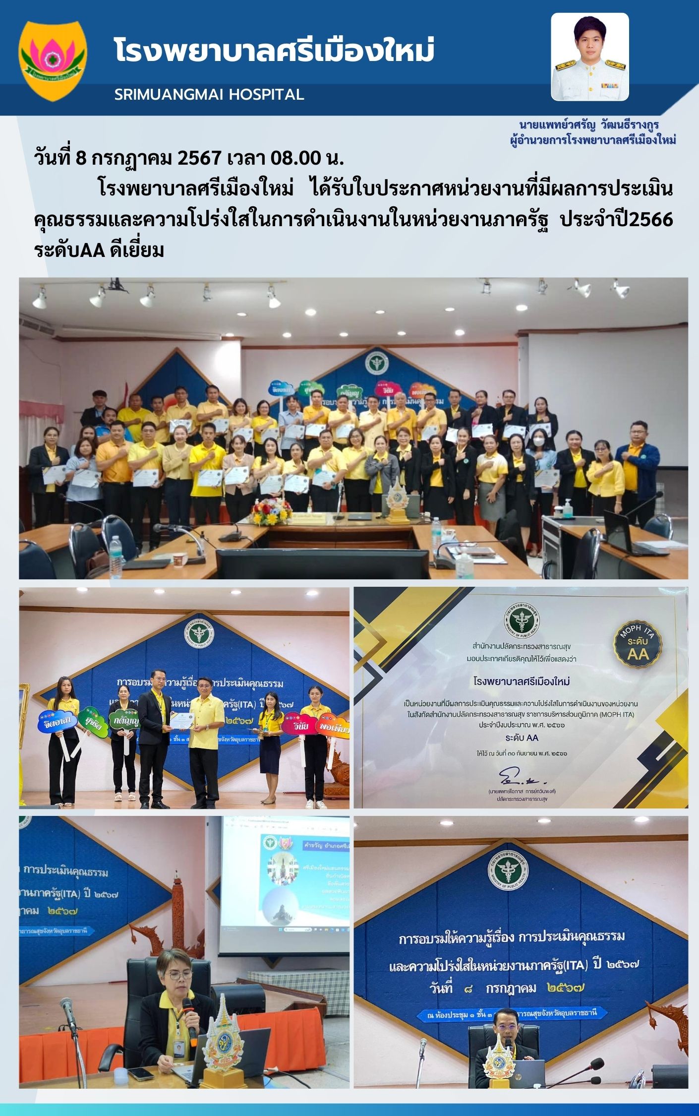 โรงพยาบาลศรีเมืองใหม่ ได้รับใบประกาศหน่วยงานที่มีผลการประเมินคุณธรรมและความโปร่งใสในการดำเนินงานในหน่วยงานภาครัฐ ประจำปี2566 ระดับAA ดีเยี่ยม